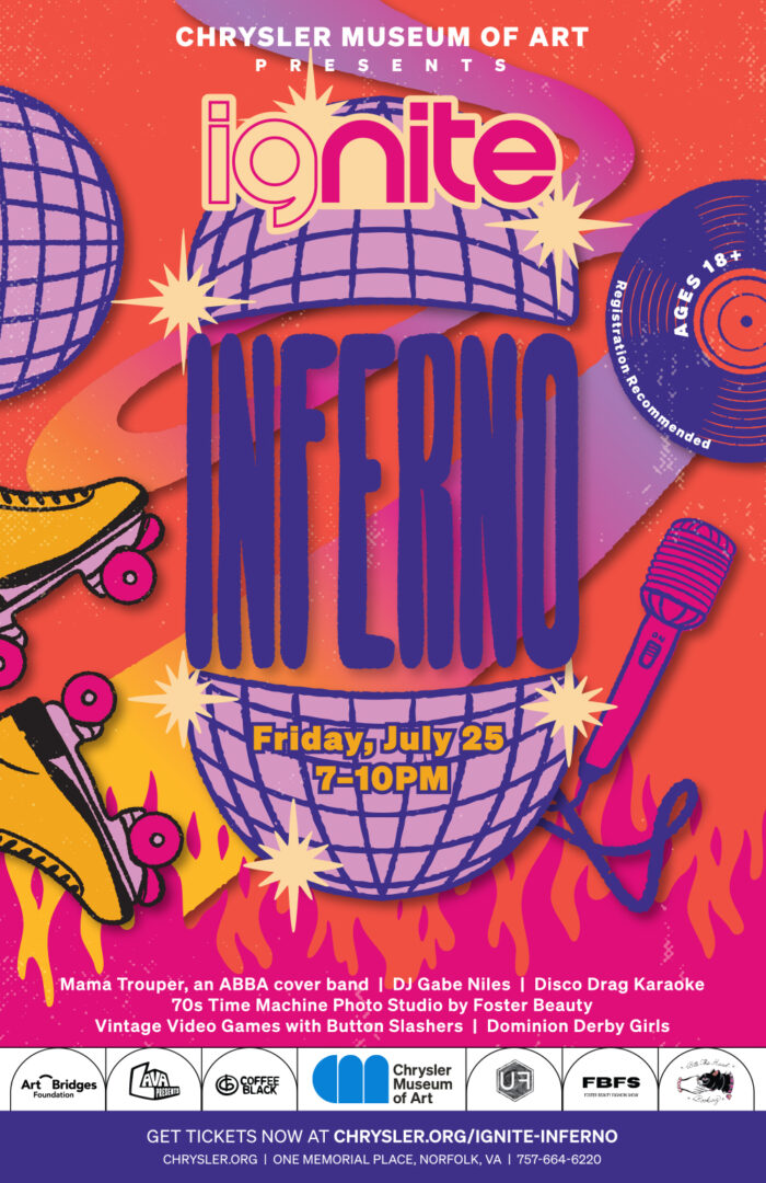 Explore a reimagined nightlife experience set against the backdrop of the Museum’s renowned collection. General admission for IgNITE: Inferno is $25, with discounted admission of $10 available to Chrysler Museum members. Ticket prices increase by $10 at the door. Guests must be 18 years of age or older to attend. Advance registration is recommended. To purchase tickets to visit chrysler.org/ignite-inferno and stay up-to-date on upcoming events, exhibitions and more at chrysler.org or follow on social media @ChryslerMuseum.